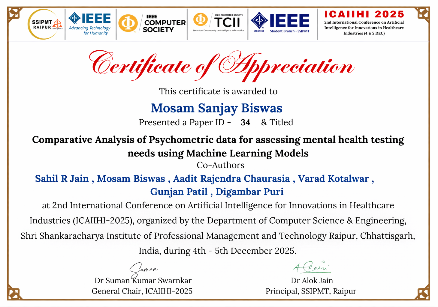 “Comparative Analysis of Psychometric data for assessing mental health testing needs using Machine Learning Models” explores how supervised ML can help decide whether an individual should proceed to a more comprehensive mental health evaluation based on psychometric responses (PHQ-9 and GAD-7).